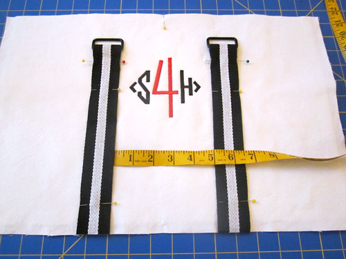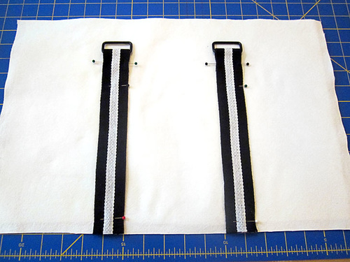 - Place two accent Belting strips on the front of each panel. The Belting should be centered side to side and the two lengths should be 5” apart. Pin the lengths in place.
