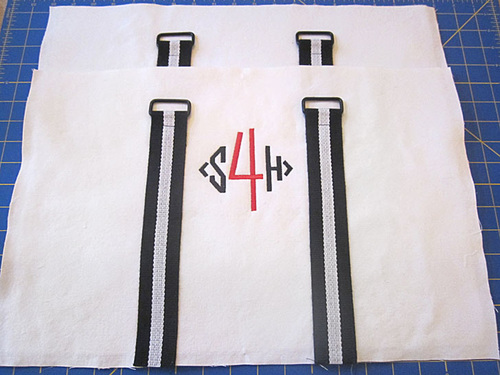 - Find the front and back exterior panels, both of which should have their fleece panels fused in place and one of which may have an optional monogram.
