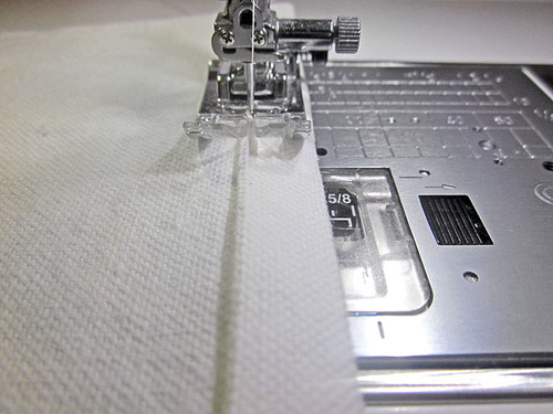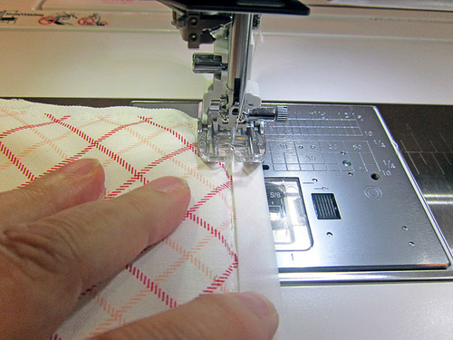 - Edgestitch along the inner fold of the binding tape through all the layers. Go slowly and carefully to insure you are catching both sides of the tape in this one seam. If your machine has the ability to adjust the needle position, you can use that feature to move your needle to the left to allow you to get as close as possible to the seam line.