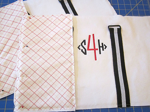 NOTE: We placed the lining panel with the pocket wrong sides together with the front exterior panel. This covered up the back of the monogram so there would be no “show through” with the thinner cotton lining fabric. This placement is optional; if you have no monogram or if you prefer your pocket at the back of a bag, you can certainly switch the position.