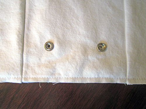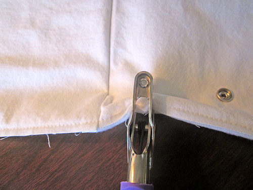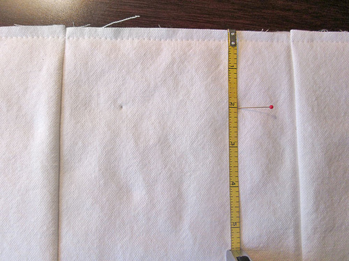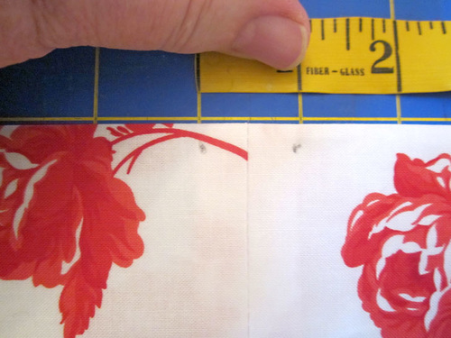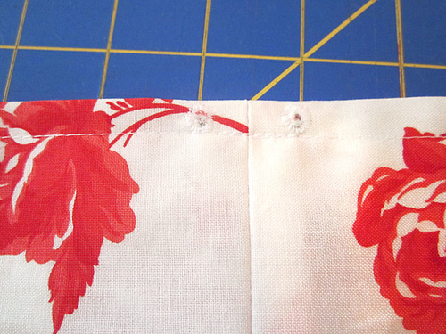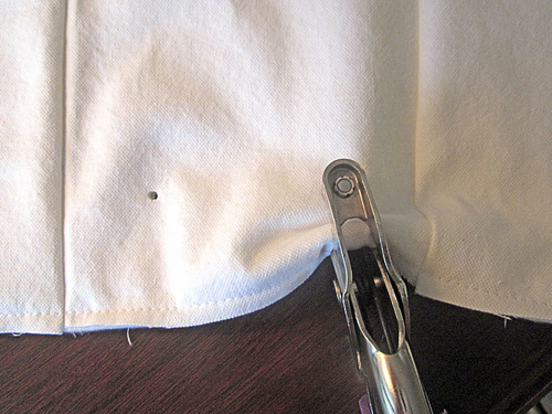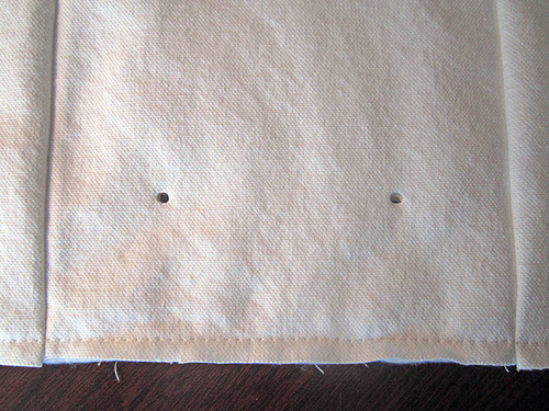 - Mark for eyelet openings to either side of one side seam (it doesn’t really matter which side the opening is on). The points should be ½” to either side of the seam (so there is 1” between the marks) and ¼” down from the top folded edge.