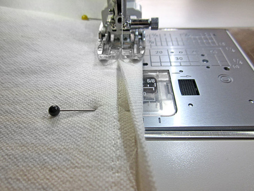 - Re-set and re-pin in the same manner to stitch the remaining three sides of the base panel, stitching one side at a time, starting and stopping ½” in at the marked corners. As mentioned, we like to stitch each short side first, then each long side.