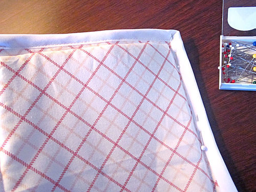- Pin in place around all four sections of the base panel seam allowance. You can fold in each corner at a diagonal, similarly to how you’d handle a blanket corner.