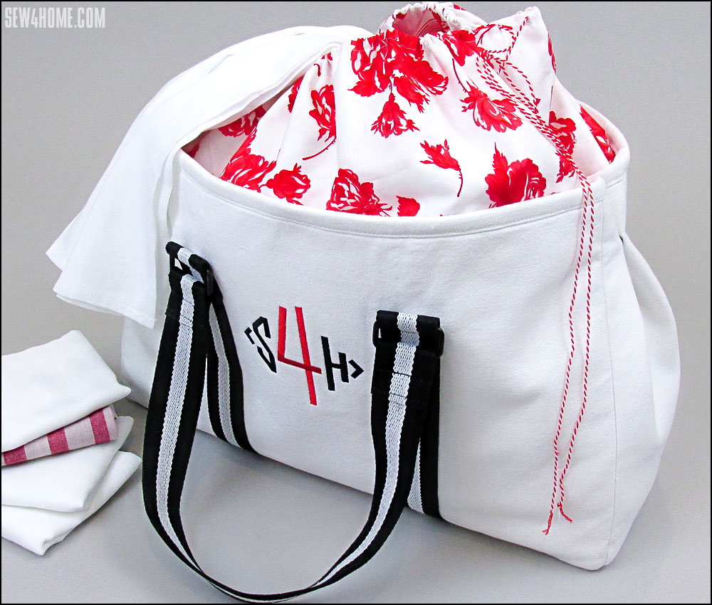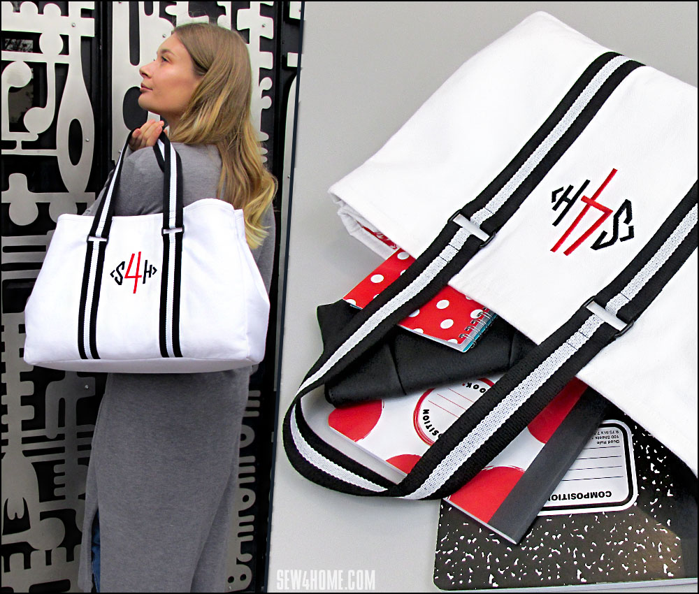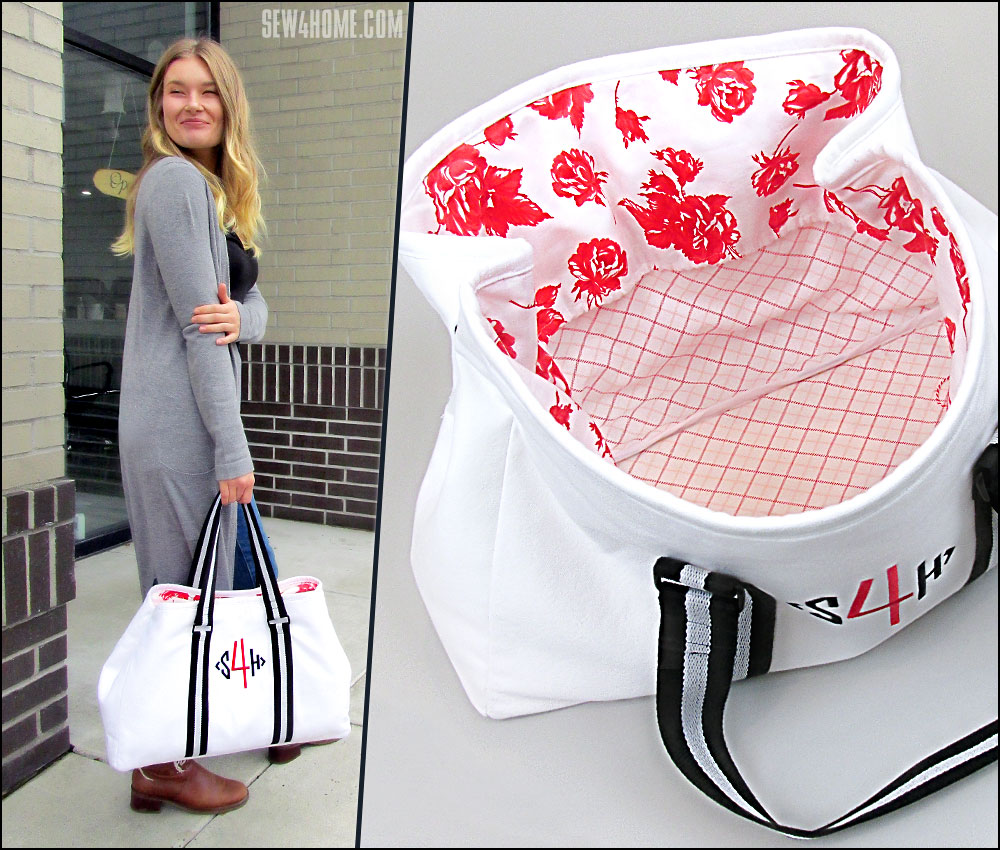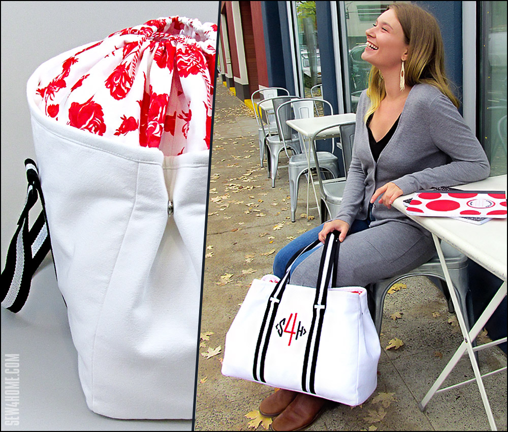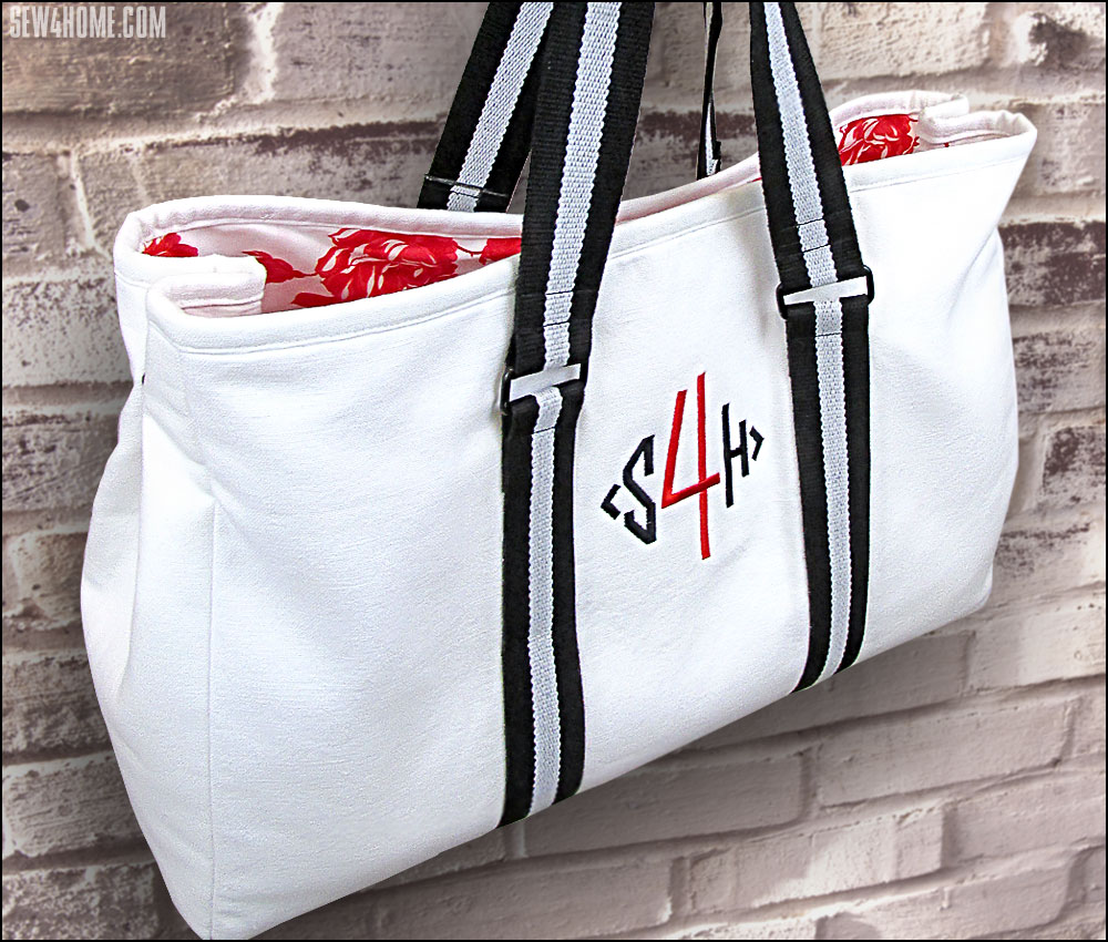 Our tote features a bold Sew4Home monogram on the front centered between the handle accents. This is optional, but is a nice way to customize the tote for yourself or as a gift. We used two colors to simulate our logo, but a traditional single-color monogram would look great as well.