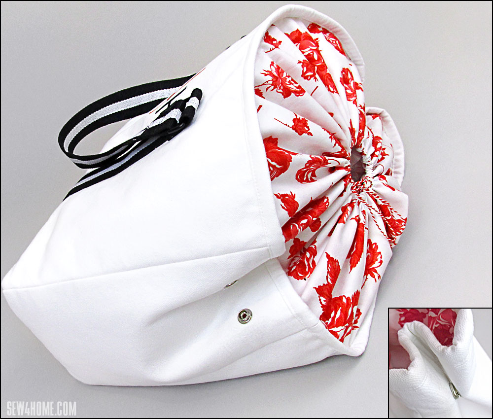 This very versatile tote is a little like one of those Transformer toys. You think it’s one shape, then it morphs into another – and another! Heavy duty snaps on both side panels let you open it wide – to a full 6” depth – or cinch it down to a handy tapered top. The two-part lining pulls up to form a clever drawstring cover, protecting the contents inside… or just adding a pop of pretty color. Another striking highlight is the bold belting for the handles. We used 1½” Dritz belting in a dramatic black and white stripe.