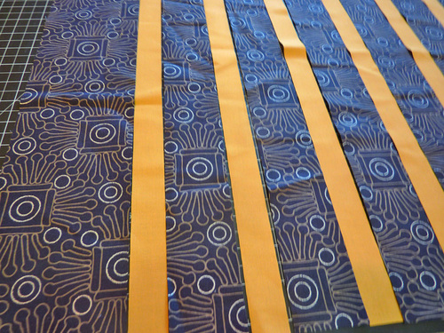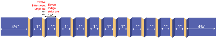 - Find all the 19″ strips. Lay them out on your work surface in order. Start with the 4¼” print strip, then alternate solid strips and print strips. The final strip in the pattern should be the 4¾” print strip.