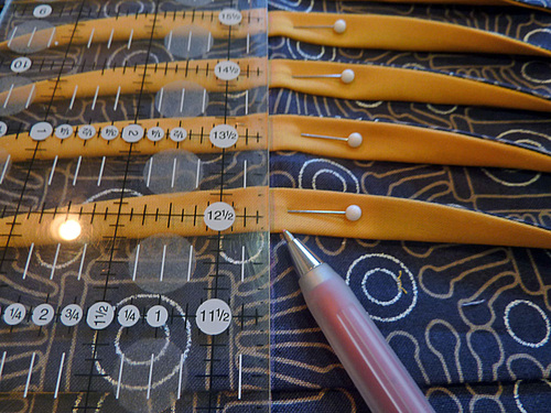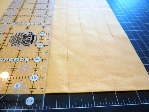 TWO 13″ wide x 19″ high rectangles for the pillow back - From the solid fabric (Butterscotch Kona Cotton in our sample), cut TWELVE 1″ x 19″ strips for the pleats.