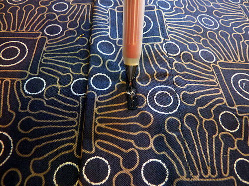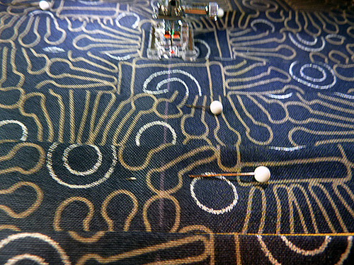 - ¾ yard of 44″+ cotton fabric with a print design; we originally used Sultan Crowns in Indigo from the Facets collection by Andover Fabrics