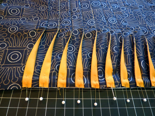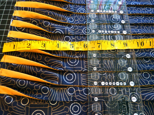 - With all the strips in place, pinch and fold along each print/solid seam to create a pleat.