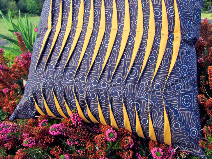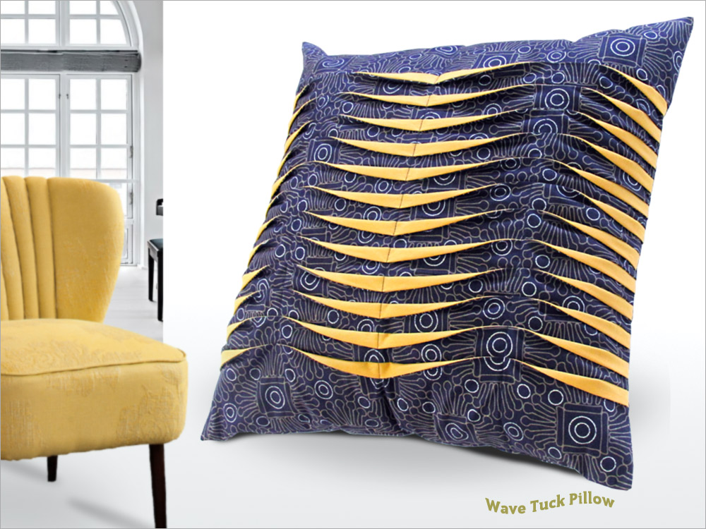 Pleats and tucks are one of the most versatile sewing embellishments. S4H offers several step-by-step tutorials on some of our favorites: Box Pleats, Knife Pleats, and for this pretty pillow: Wave Tucks. Clever folding and stitching with two contrasting fabrics creates a wonderfully textural effect. We’ve used it here on a pillow front; bet you can think of lots of other projects that need some rippling waves.