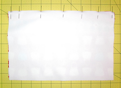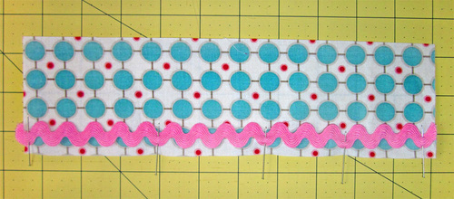 - Pin the rick rack to the right side of the fabric, along the BOTTOM 10½” width, positioning the rick rack so the top “waves” are ¼” from the raw edge of the fabric.