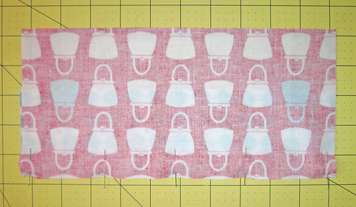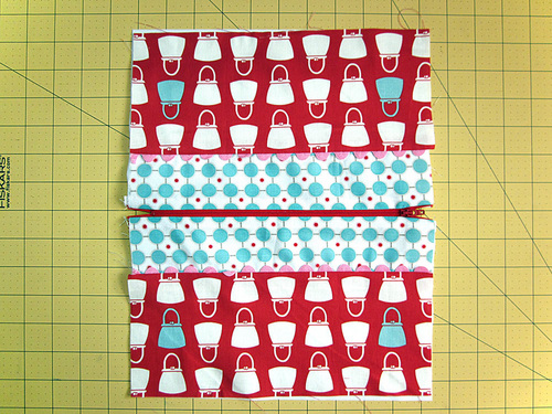 - From the bottom fabric (Millie’s Purses in our sample), fussy cut TWO 5″ high x 10½” wide rectangles