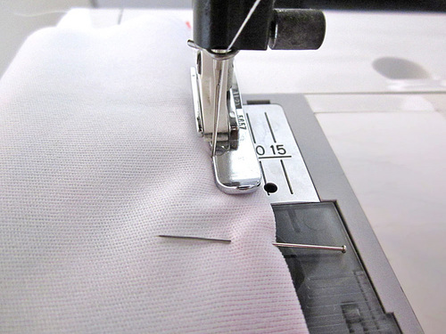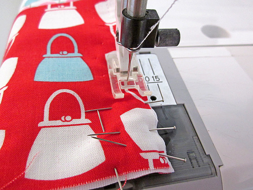 - Stitch as close to the zipper as the foot will allow, removing the pins as you sew.