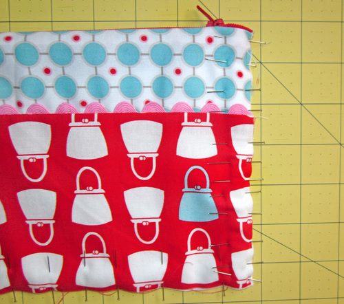 - Lay a 10½” x 7″ piece of lining, right side down, on top of the front piece, sandwiching the zipper in between the two layers of fabric. As above, line up the top raw edge with the edge of the zipper tape. Pin all three layers together, being careful to pin through just the top of the zipper. You need to be able to open and close the zipper; you can’t do that if you’ve pinned through the whole thing.