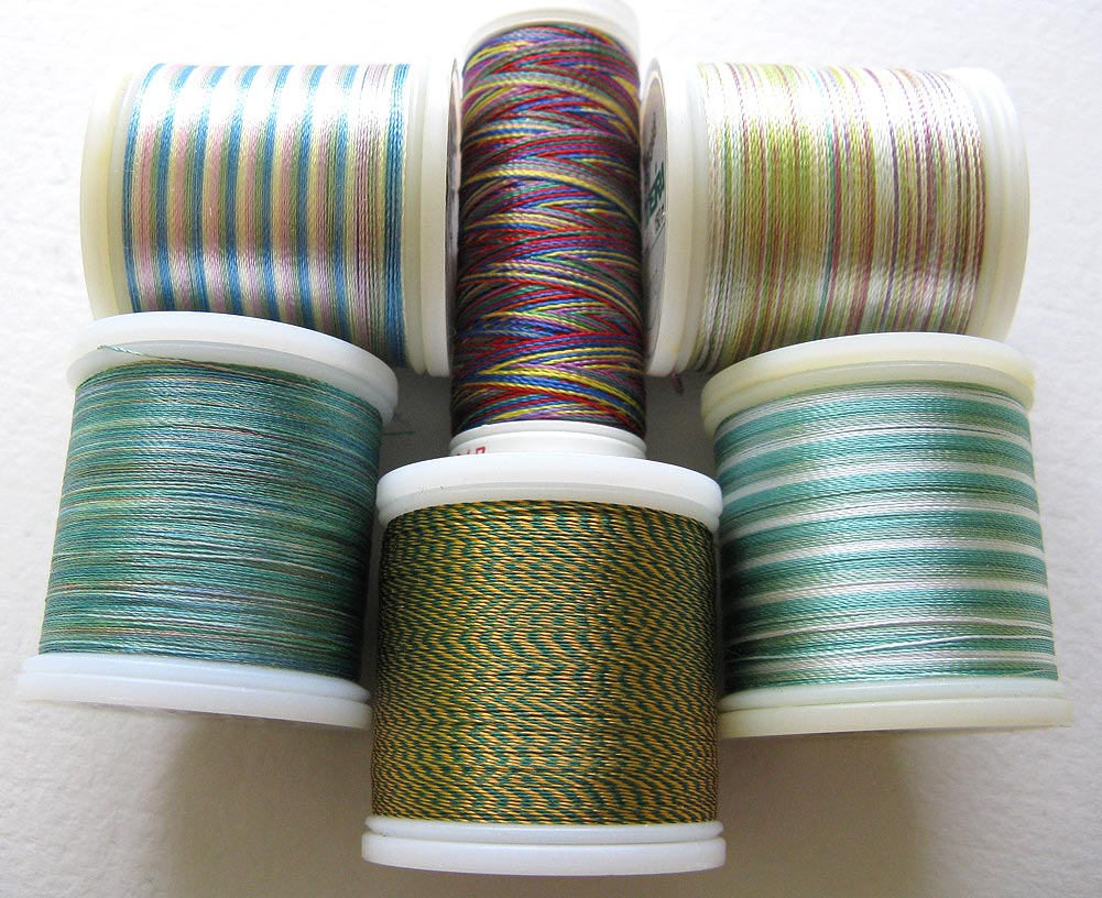 There are literally hundreds and hundreds of colors available. But even then, sometimes a fabric’s print or specific shade is simply impossible to match. For these projects, you might want to consider a variegated or multi-color thread. These threads usually come in two versions: One is a color range of the same color – like light orange to deep orange. Others have 2, 3, or 4 different colors in the same strand – and the colors move from one to the next, and then repeat. These colors may repeat regularly, say every 6 inches, or randomly through a range of 2.5 to 5 inches.
