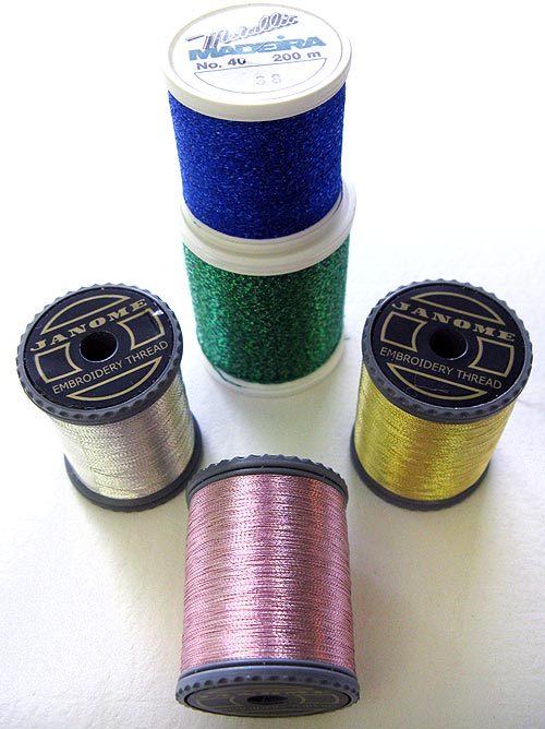 Metallic threads look a little like tinsel and can add great decorative effects to your quilts. However, metallics can be fussy, and require a special needle and special tension considerations, but the overall effect is well worth the extra futzing.