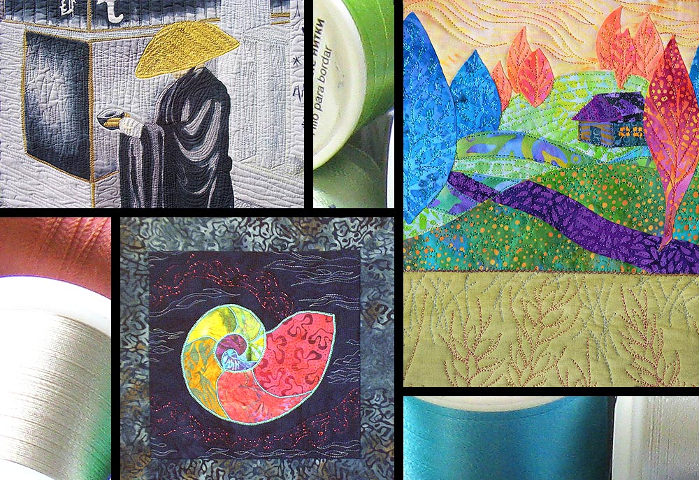 For the most part, thread is something you use to get a job done, and you’ll often just want a standard all-purpose sewing thread. But, there are so many incredible options out there, why not check them out and experiment with all the effects you can create. Quilters often equate working with thread to painting. One quilt artist we particularly admire is Sarah Ann Smith. We used some close-up images from a variety of Sarah’s art quilts in the photo collage above. Wow!