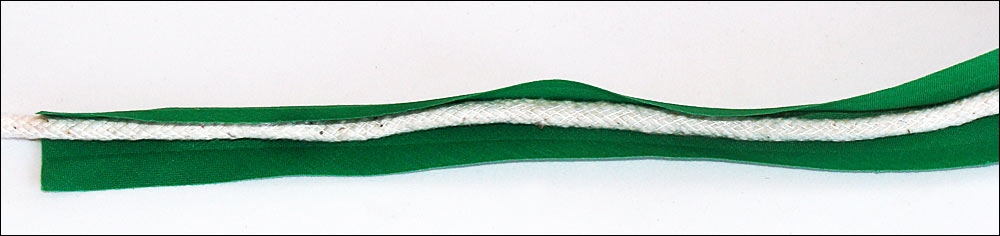 To make piping, you take a bias strip and fold it over the piping cord. To attach it to your article you sew the open end into the seam.