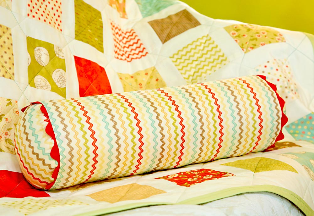 This comfy neckroll is the first of a trio of wonderful Whimsy projects. Joanna Figueroa’s Whimsy collection, for Moda Fabrics, debuted in February of this year, so we’ve been admiring it now for several months. We fell in love with its soft, warm colors and the nostalgic prints, florals and stripes. I even love the names of the colors: buttercup, beach, chocolate and grass are just a few that make me want to lie on my back and look for the bunnies and dragons in the fluffy spring clouds. Joanna’s simple line drawings of vintage wagons, milk jugs and chickens are perfect throw-backs to the old Dick and Jane early-reader books. ‘See Liz sew. Sew, Liz, Sew!’ Our roly-poly neckroll pillow features the Whimsy Wavy Ric Rac design. Neckrolls are great for youself and make a much-loved gift for anyone on your list who’s had a hard day and needs a little nap.