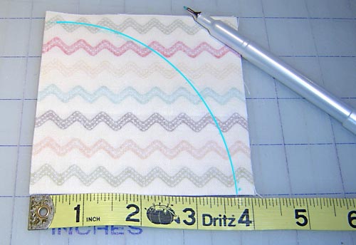 - Place a see-through ruler or tape measure at the exact center of this lower left corner and swing the ruler/tape from the top to the bottom of the square, like a pendulum, measuring and marking a dot at the 3¾” point in three to four spots. You are creating a semi-circle.