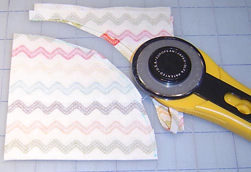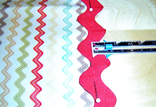 NOTE: You should be able to easily tell which sides the ric rac is sewn to by the direction of the print. Also, remember that you want a good portion of the ric rac to stick out from the seam on either end, so consider this when you position it in case your ric ric is smaller than ours.