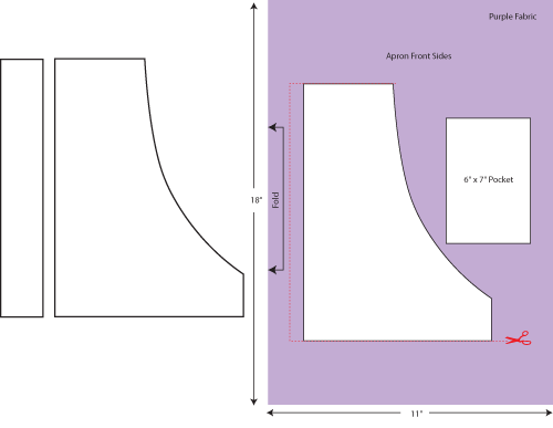 - Fold the Side Front/Pocket Fat Quarter (Purple Wallpaper in our sample) in half (18″ x 11″). Using the Larger Apron Bib paper pattern, cut two bib pieces. As shown in the diagram below, you need to mark and cut an extra ½” beyond the long straight side for the seam allowance. From the leftover fabric cut two 6″ x 7″ rectangles for the pockets.