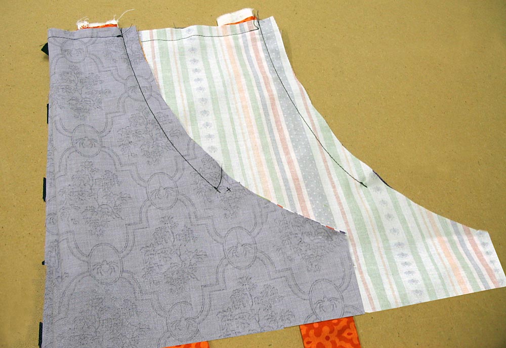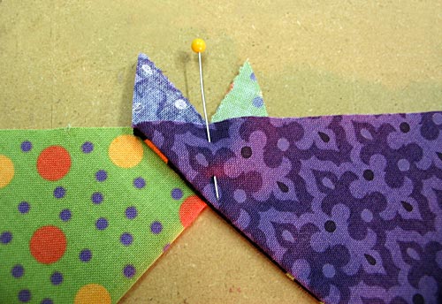 NOTE: Yes… you did cut through your seam. Not to worry, we’ll secure it again when we attach the flounce. - Overlap the four triangles, matching up the little ‘ears’ so the raw edges of the triangles are flush, and pin in place.