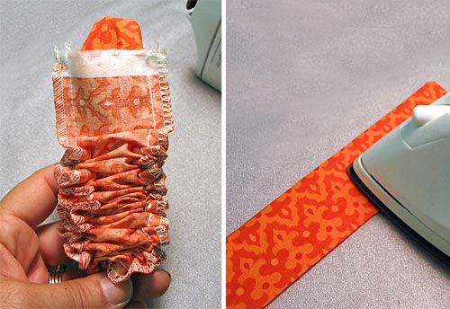- For the neck ties, fold each of the two orange jelly roll strips in half (2½” x 22″), right sides together, and sew across one end and along the long side with a ½”seam. We finished our seams with a serger but you could use a machine sewn finish or leave them raw.