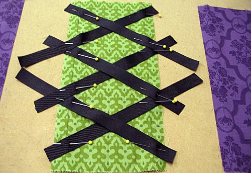 - Arrange the six ribbon lengths in a criss-cross pattern as shown in the photo below. Play with the spacing until you are satisfied with the balance of your look. Remember, you won’t see anything beyond the seam allowance line.