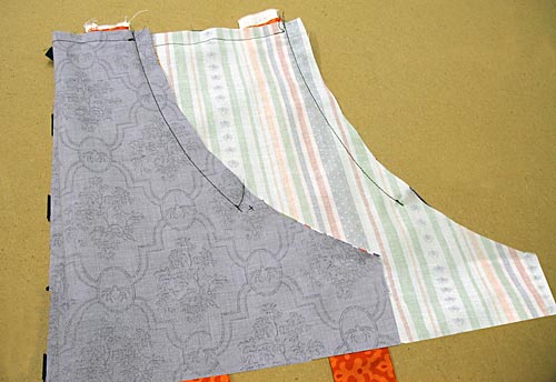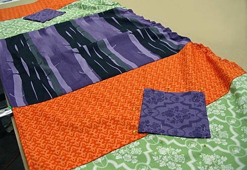 - Using a ½” seam allowance, stitch the skirt panels together along the 22″ sides. We stitched ours in the following order: Orange Campfire half, Green Wallpaper half, Purple Forest full, Orange Campfire half, Green Wallpaper half.