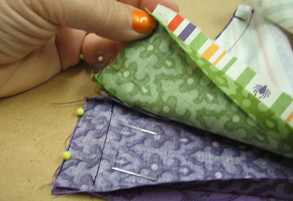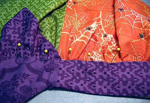 - Pick two pairs and place them right sides together. We paired Purple Campfire with Black/Purple Dots and Orange Spider Web with Green Dots.