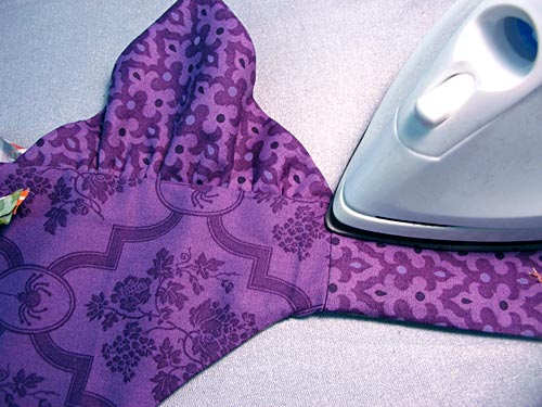 - You now have four triangles. Turn them right side out. Use a blunt edged tool, like a knitting needle or chopstick, to push out the the bottom point. You want it to be nice and sharp. Press flat. Don’t trim off those little ‘ears’ in the open corners yet.