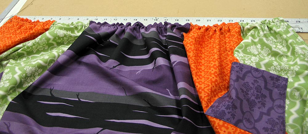 - From the remaining THREE Fat Quarters (or the 18″ x 22″ pieces of fabric), leave the piece you want for the center panel uncut. We used Purple Forest, running the trees horizontally for a 22″ high x 18″ wide panel. We figured it was a spooky forest that had fallen down. Cut the other two Fat Quarters in half to create 22″ high x 9″ wide rectangles. We used Green Wallpaper and Orange Campfire. Both of these are running horizontally as well to create the panel shape we need for a proper skirt length.