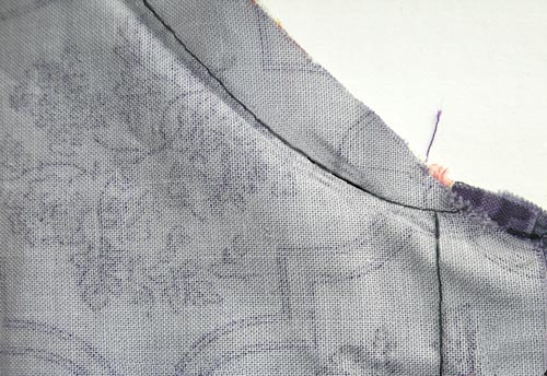 - Pin from the top edge along the curved arm hole, stopping at the marked dot (this is the dot shown on the paper pattern; you should have transferred this dot from the pattern to your apron front and lining fabric pieces). Using a ½” seam allowance, stitch from the top edge to the dot, locking your seam at the start and at the dot.