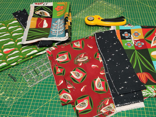 This project features a design that beautifully blends three fabrics. We selected what we feel is a “holiday-ish” theme – it is an official Christmas collection, but the color palette and the motifs have a tone and graphic appeal that can easily last long after Santa’s sleigh bells have faded.