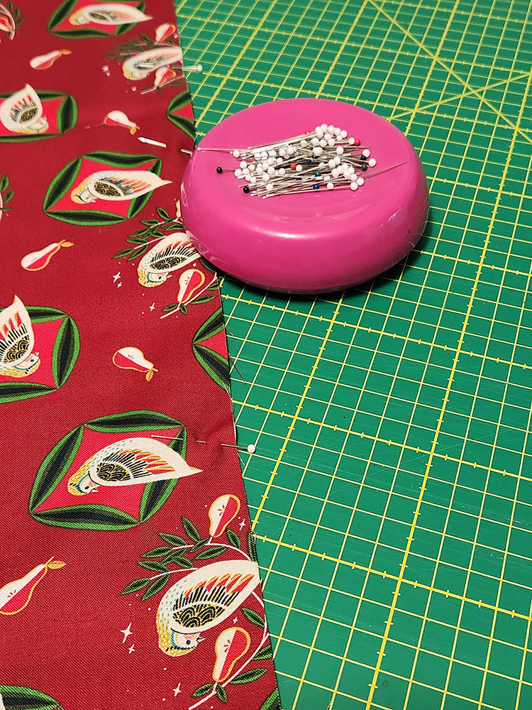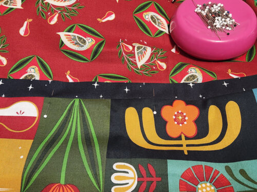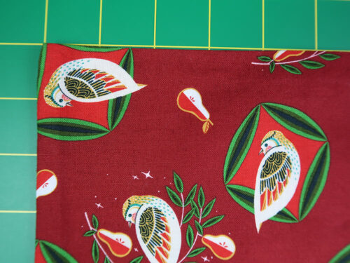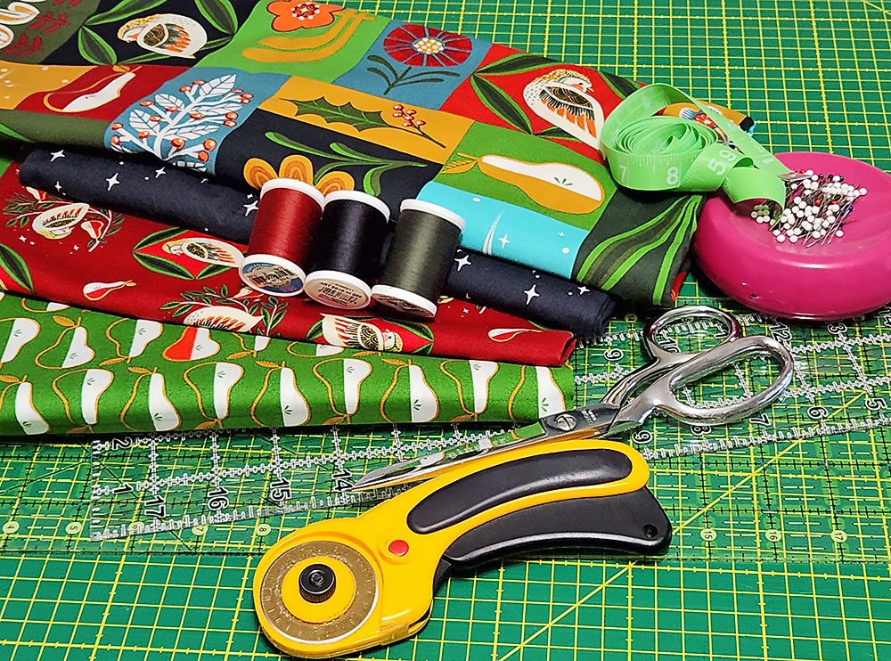 - 1 – 1½ yards of 44″+ wide fabric for the pillowcase body; we used Christmas Pears in Pear and Partridge in Dark Red both from the 12 Days of Christmas collection by Cori Dantini for FreeSpirit Fabrics