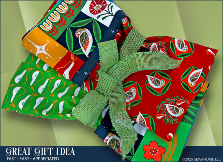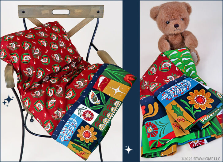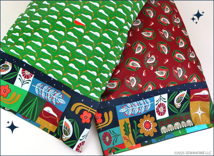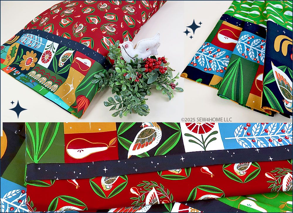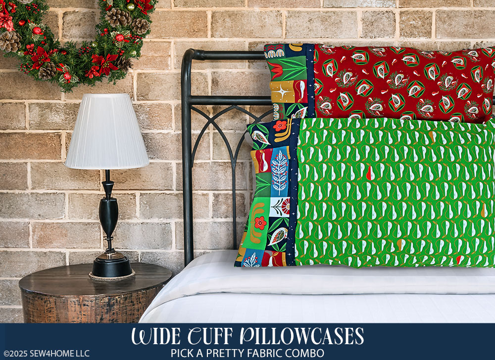The collection is Twelve Days of Christmas by Cori Dantini for FreeSpirit Fabrics. It’s in stores and online now, and we always suggest shopping for and buying seasonal fabric early. Popular prints can sell out in a snap. We’ve detailed the four fabrics we chose in the Supply List below. Even though we made two pillowcases, we used only four fabrics. By keeping the cuff and flange fabrics consistent, changing out just the body of each case, the two come together better as a set.