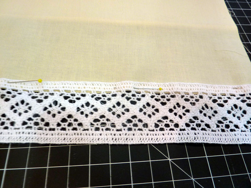 NOTE: Another option for this type of narrow hem is to fold back the raw edge ½” to start and then simply tuck the raw edge back into the fold so the final width is ¼”. Some people like this method because a tiny ¼” pressed edge can be hard to keep consistent over long lengths. - Find one length of lace. Place the top edge of the lace directly over the narrow bottom hem of the top solid panel. You are placing the lace on the right side of the fabric panel. Pin in place across the entire length, making sure the lace stays straight. You can simply re-use the pins holding the narrow hem in place, re-pinning through the lace and the fabric.