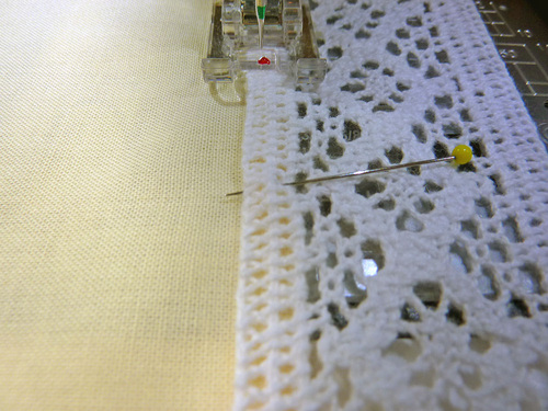 NOTE: If necessary, re-thread the machine with thread to best match the the combination of lace and fabric in both the top and bobbin so you can stitch one long seam. - Fold the bottom and top hems back into place, following the original pressed crease lines. Re-pin in place.