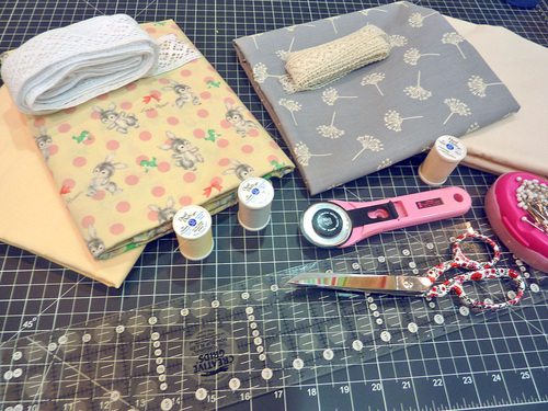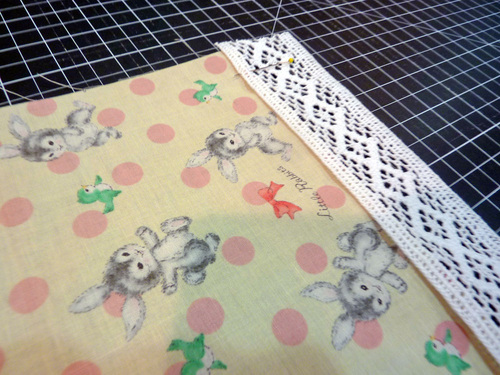 - Find the remaining length of lace. Place it along the bottom edge of the print panel – again you are working on the right side of the fabric panel. Stitch in place as you did above with the first length of lace.