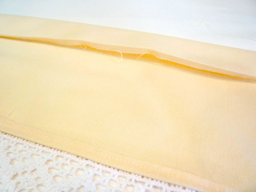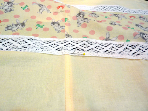 - Join the bottom panel to the assembled top and center panels in the same manner as above. Place the free edge of the second length of lace over the top narrow hem of the bottom panel and stitch in place.