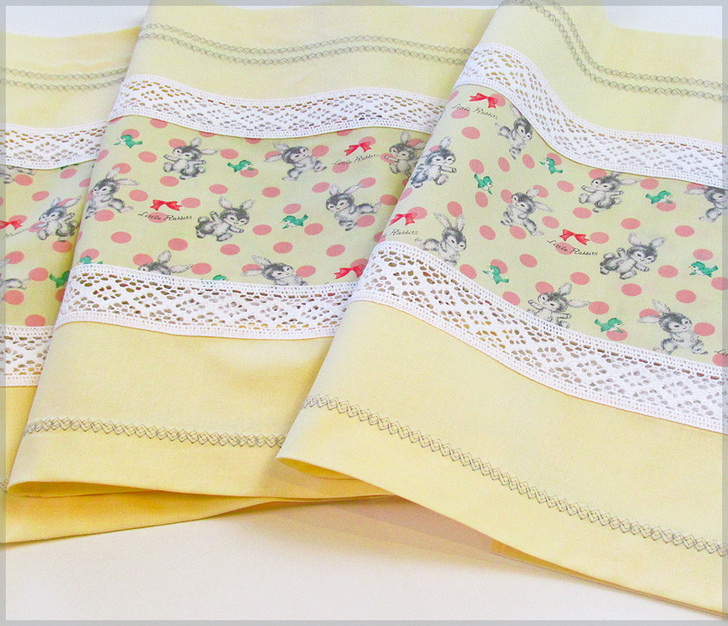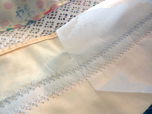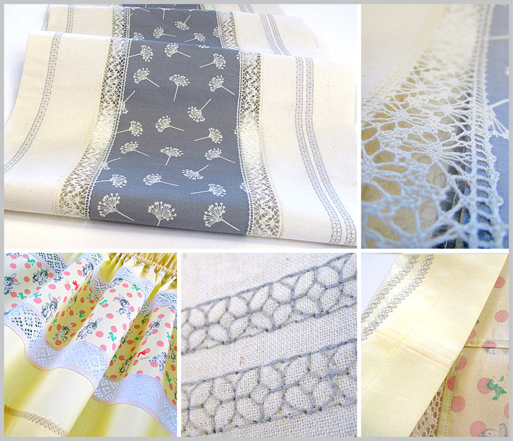 NOTE: The lace strips are topstitched in place to allow for the cleanest finish on the back of the valances (remember, they are just a single layer of fabric), which is why you want a lace with a finished edge both top and bottom. - 2 yards of 12″+ wide tearaway stabilizer for decorative stitching