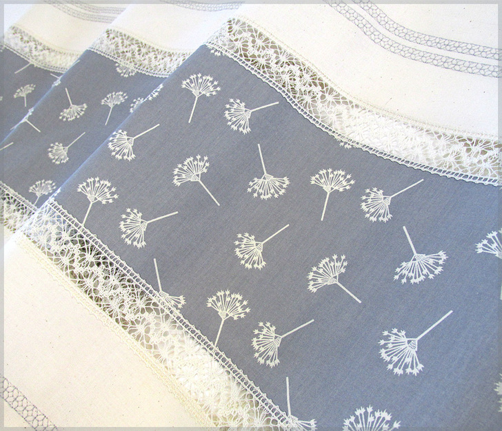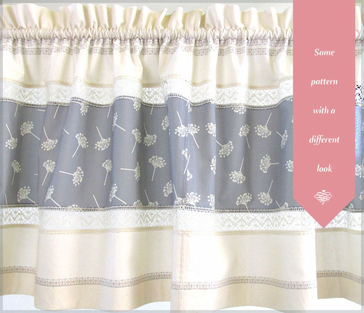 The gray modern valance used a combination of slightly thicker cottons and the lace is also a bit stiffer – almost like a tatting. This gave the valance a crisper look and produced more flare along the bottom roll of the hem.