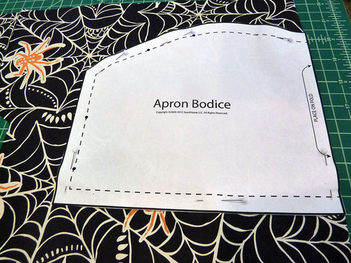 - As above with the bodice appliqué, the pocket and bottom hem appliqués will be cut from the accent fabric (Witches Brew in Multi in our sample) in the steps below.