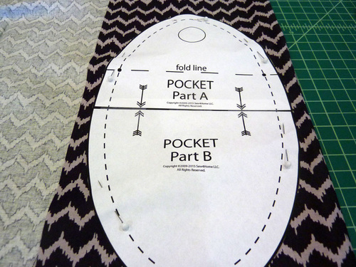 IMPORTANT: Each pattern download consists of ONE 8½” x 11″ sheet. You must print these PDF files at 100%. DO NOT SCALE to fit the page. Print horizontally (landscape). - Cut out each pattern piece along the solid line. Butt together (do not overlap) the two pocket pieces, using the arrows printed on the pattern as a guide. Tape together.