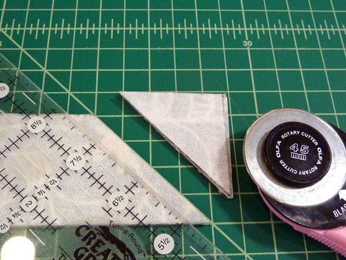 - With a see-through ruler and rotary cutter, trim one end of each folded tie at a 45˚ angle.