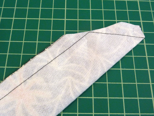 - Using a ½” seam allowance, stitch the side and across the angled end, pivoting at the corner. Leave opposite end open for turning.