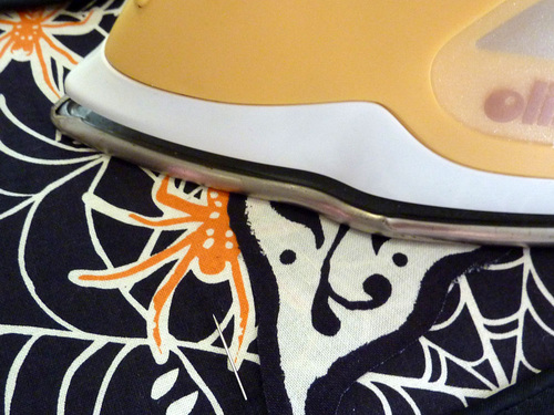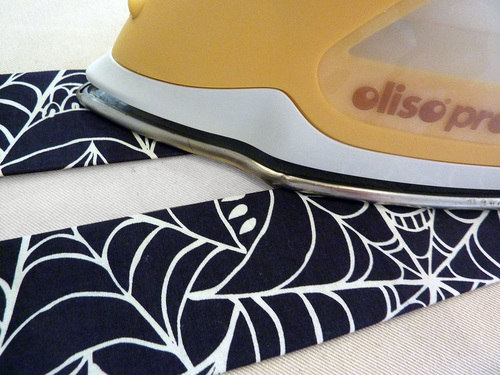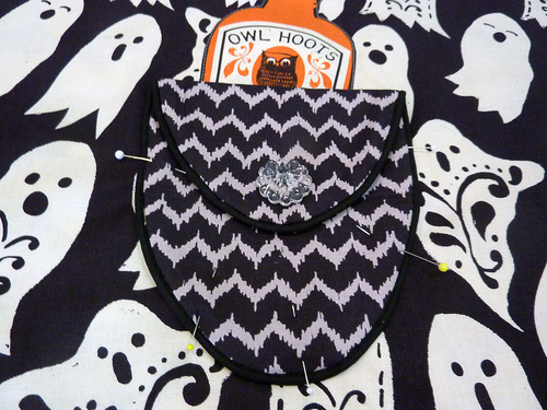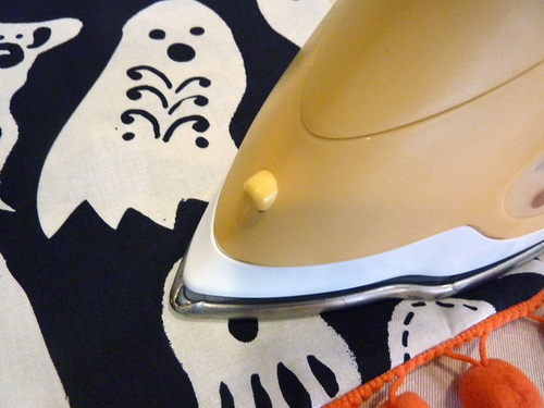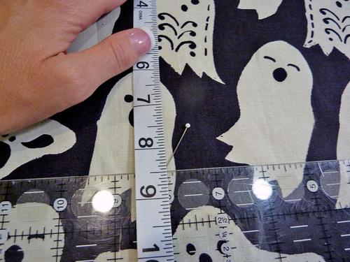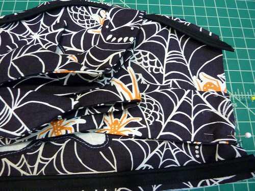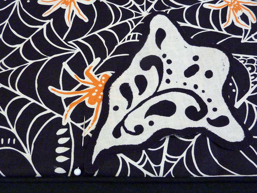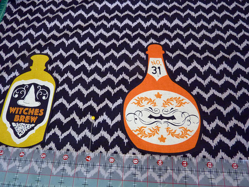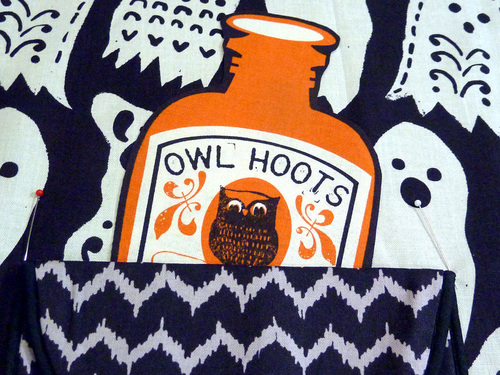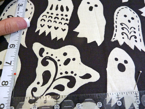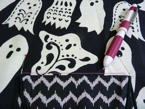 Part of the fun are the clever appliqués at the pocket and along the bottom of the main skirt. We carefully fussy cut six bloodcurdling motifs from our selected fabric, which adds a fun pop of color (and comedy).