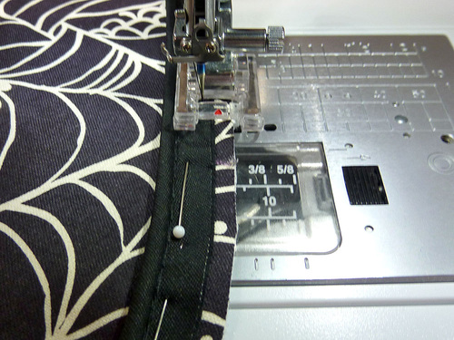 - Machine baste the piping in place along the top and bottom, using a standard foot, Statin Stitch foot (our choice with the needle moved to the left), or Zipper foot.