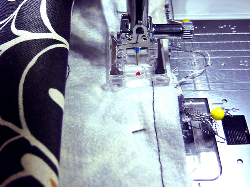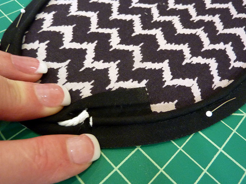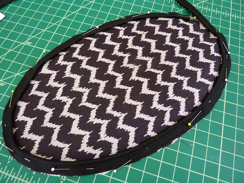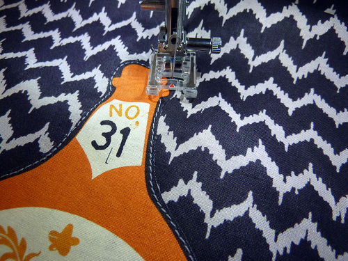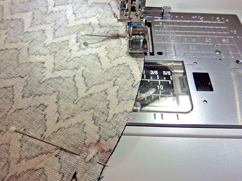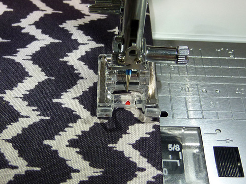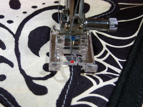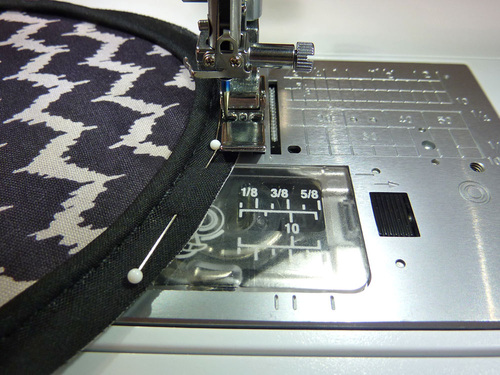 - Attach a Zipper foot. Stitch across the top and along both sides, pivoting at the corners and going slowly around the top curves. Along the top, the seam should be as close as possible to the piping. Down the sides, default to a ½” seam allowance.